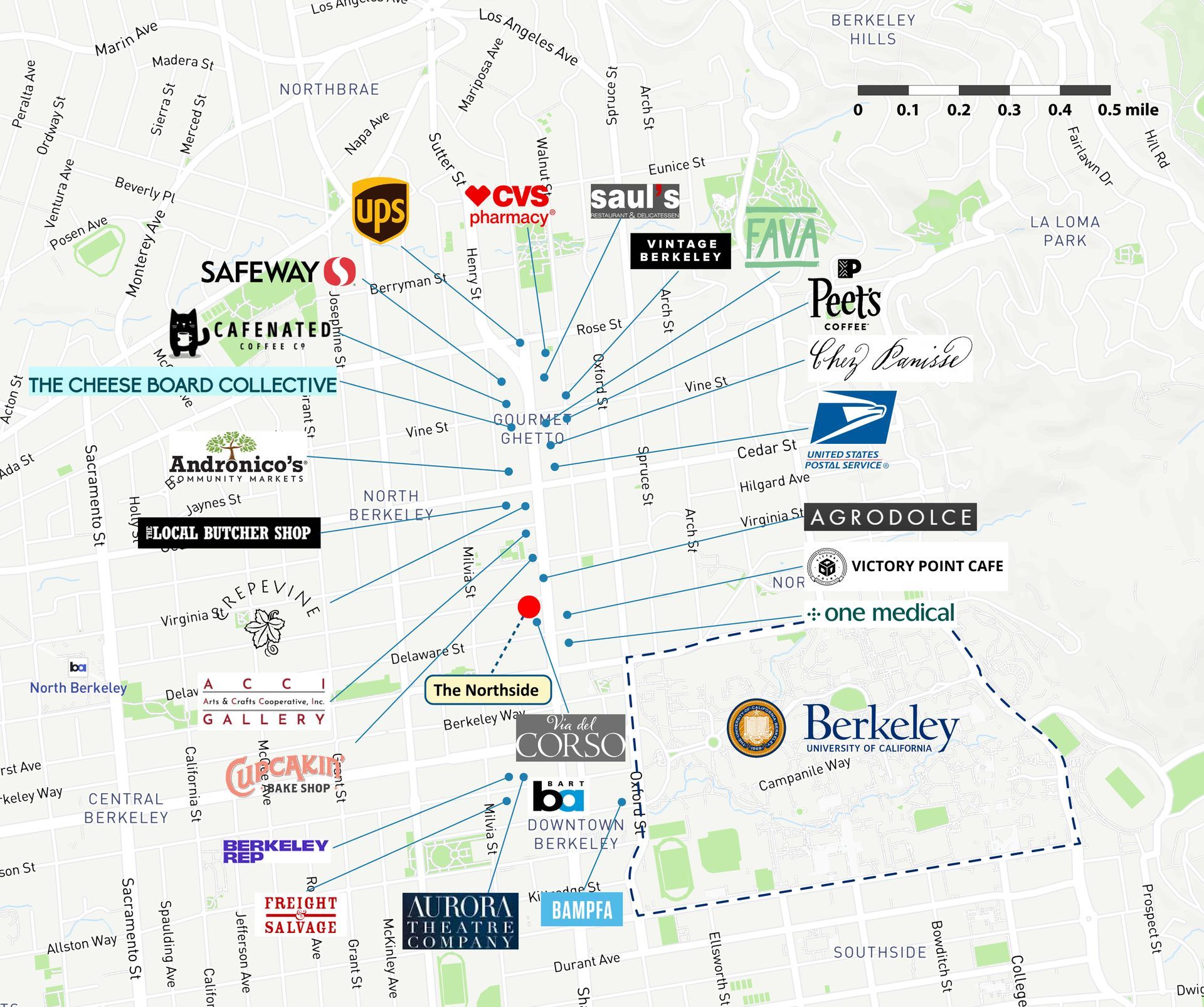 - 5 min walk to: Downtown BART, Berkeley Rep, Comal, Lucia, Blue Bottle Coffee, Andronic's, Safeway, Cheese Board, Chez Panisse, CVS