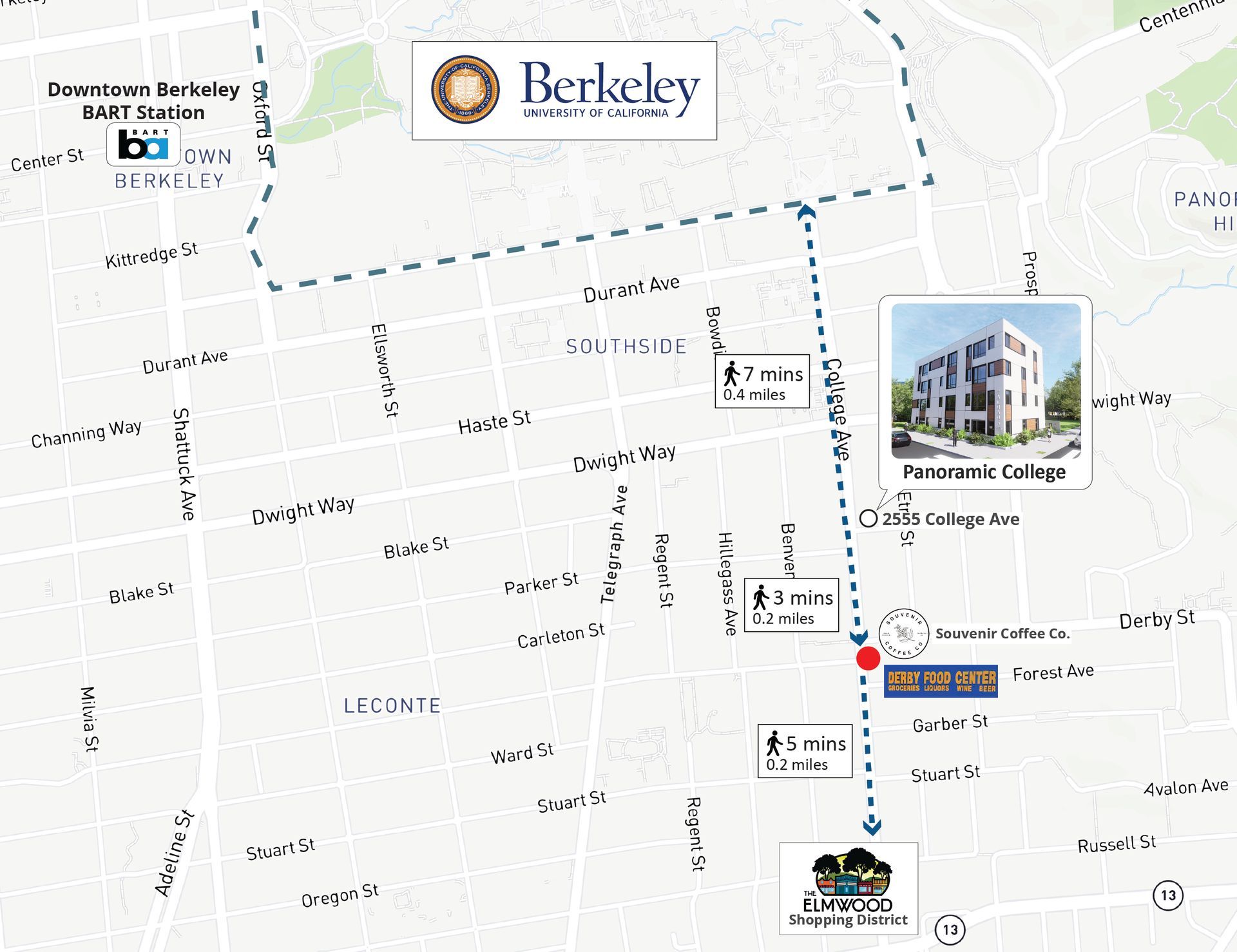 is Panoramic Interests newest furnished apartment building on College Avenue, in the prime Southside Elmwood neighborhood, a 7-minute walk to the UC Berkeley campus. This 4-level project has 12 two, three and four bedroom apartments. It includes 16 secure bike parking spaces, as well as a private courtyard and an on-site laundry room.